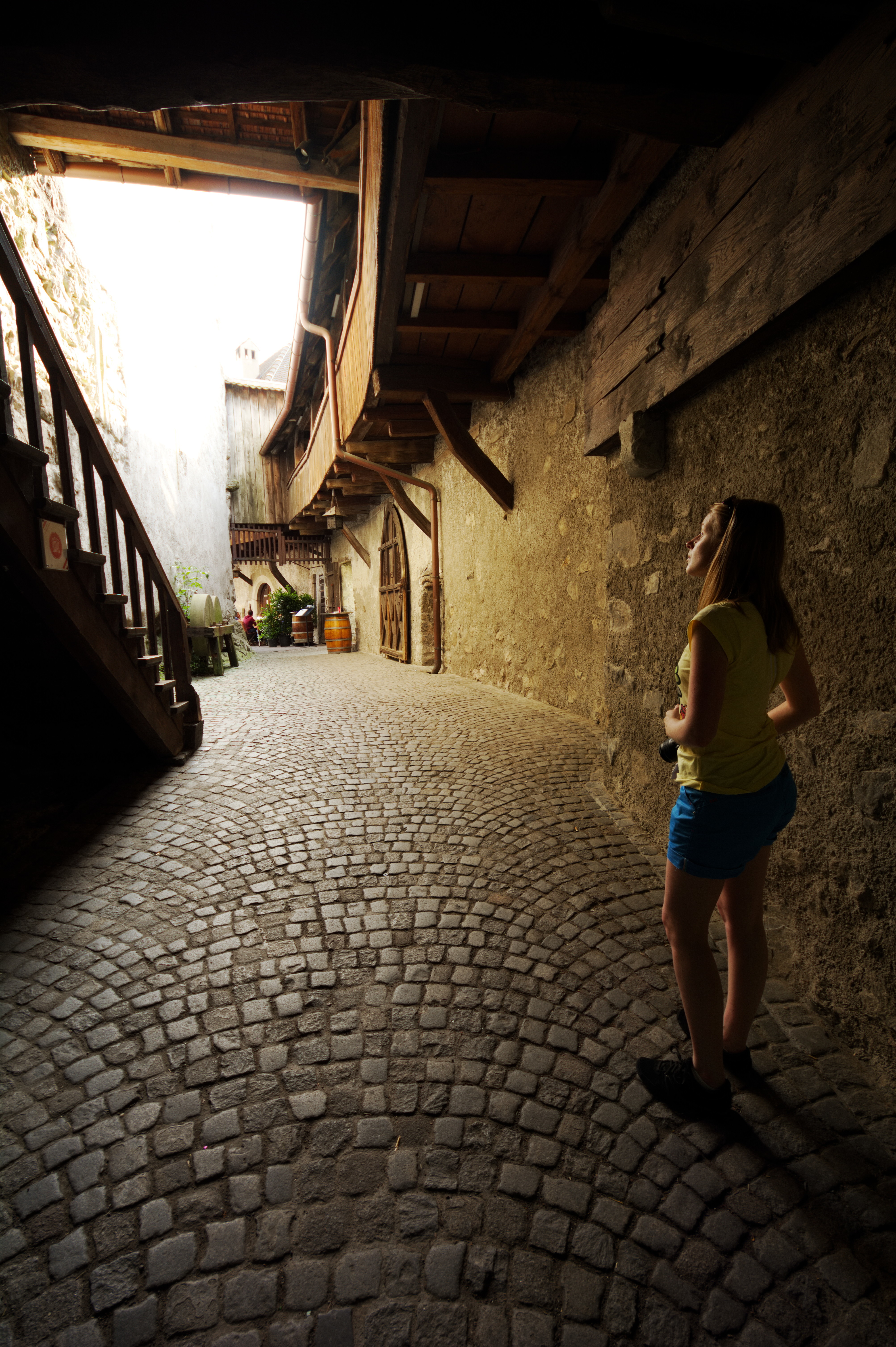 La cour intérieure du château, avec ses jolis colombages, est occupée par un restaurant.